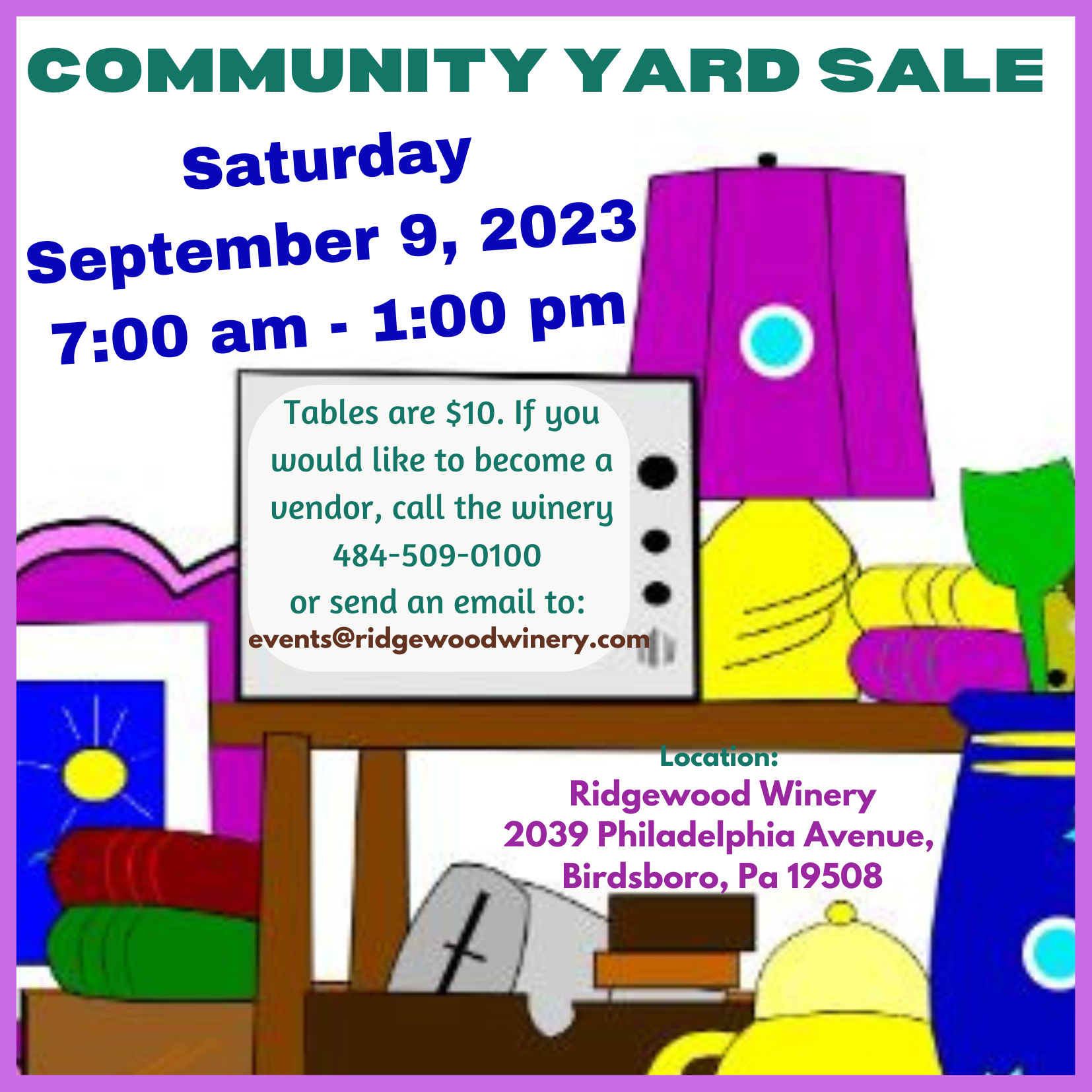 Community Yard Sale 7:00am @Ridgewood Winery Birdsboro 9.9.2023