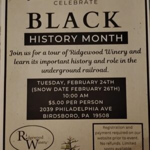 Black History Month tour of Ridgewood Winery 2.24.2026 Join us for a tour of Ridgewood Winery and learn ... 24 Feb 10:00 AM - 12:00 PM Ridgewood Winery Birdsboro2039 Philadelphia Avenue, Birdsboro Pa 19508